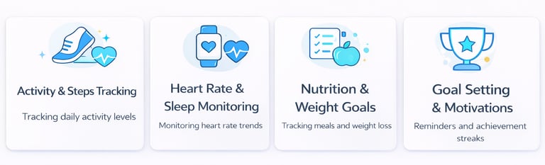Translating health-tracking needs into a simple, intuitive experience. I designed clear feature modules for activity, heart rate & sleep, nutrition, and goal setting, focusing on easy data comprehension, motivation, and daily engagement.