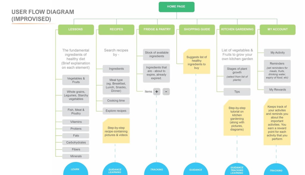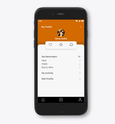 A mobile app that motivates user to learn about the fundamentals of food, new recipes, keep track of what's in the pantry and refrigerator, and urges the user to have meals and drink water at regular intervals. This app also provides guidance around kitchen gardening and reminds user about food items that are about to expire.