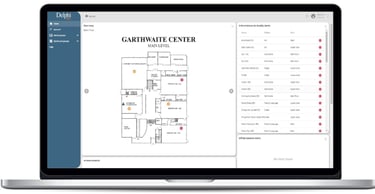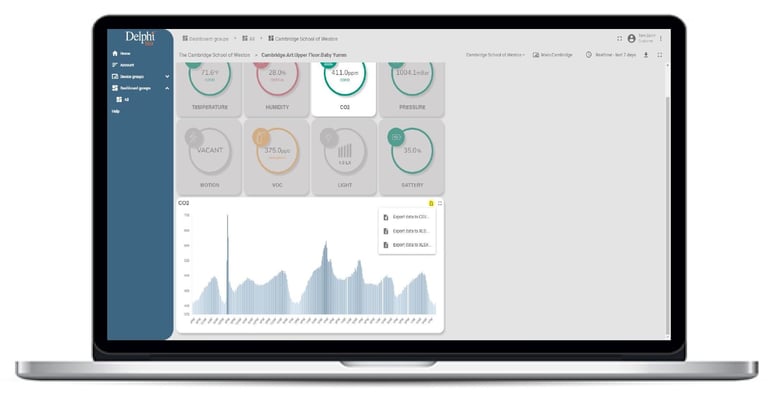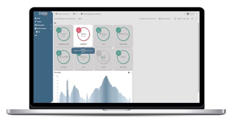 Battery-powered Indoor Air Quality sensors and Occupancy sensors are deployed on the Network server. These sensors communicate to a gateway over LoRaWAN and collect important environmental data that feeds into the Delphi360 platform for easy viewing, in real-time.