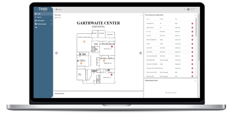 Location of sensors is displayed on the floormap of a building on the customer-facing dashboard. Colors of the sensors represents the status - Green represents that the readings are within the desired threshold, yellow represents warning state and red represents critical state that requires immediate attention.